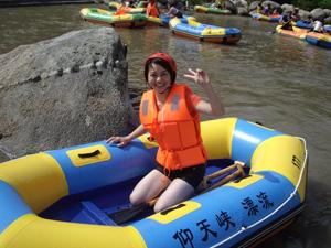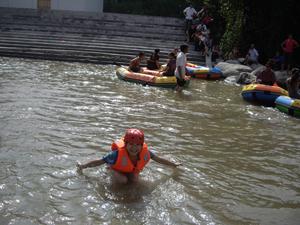 我們?cè)缟铣霭l(fā),到達(dá)奉新縣還參觀了宋應(yīng)星公園以及他的作品《天工開物》。吃過午飯,大家興高采烈向“仰天峽”進(jìn)軍!是在漂流河道的中部,有一段長約一公里的連續(xù)險(xiǎn)灘區(qū),考驗(yàn)著游客的心理承受能力,我們兩兩一組,下水了。打水仗,賽劃艇成了這群人的樂趣;在河道狹窄處,有“交通堵塞”的;在水流湍急處,有“飛天而降”的;在開闊平坦處,有“原地打轉(zhuǎn)”的。形態(tài)各異,但是樂在其中。漂流進(jìn)行了大約一個(gè)半小時(shí),從高處順流而下,直到盡頭。